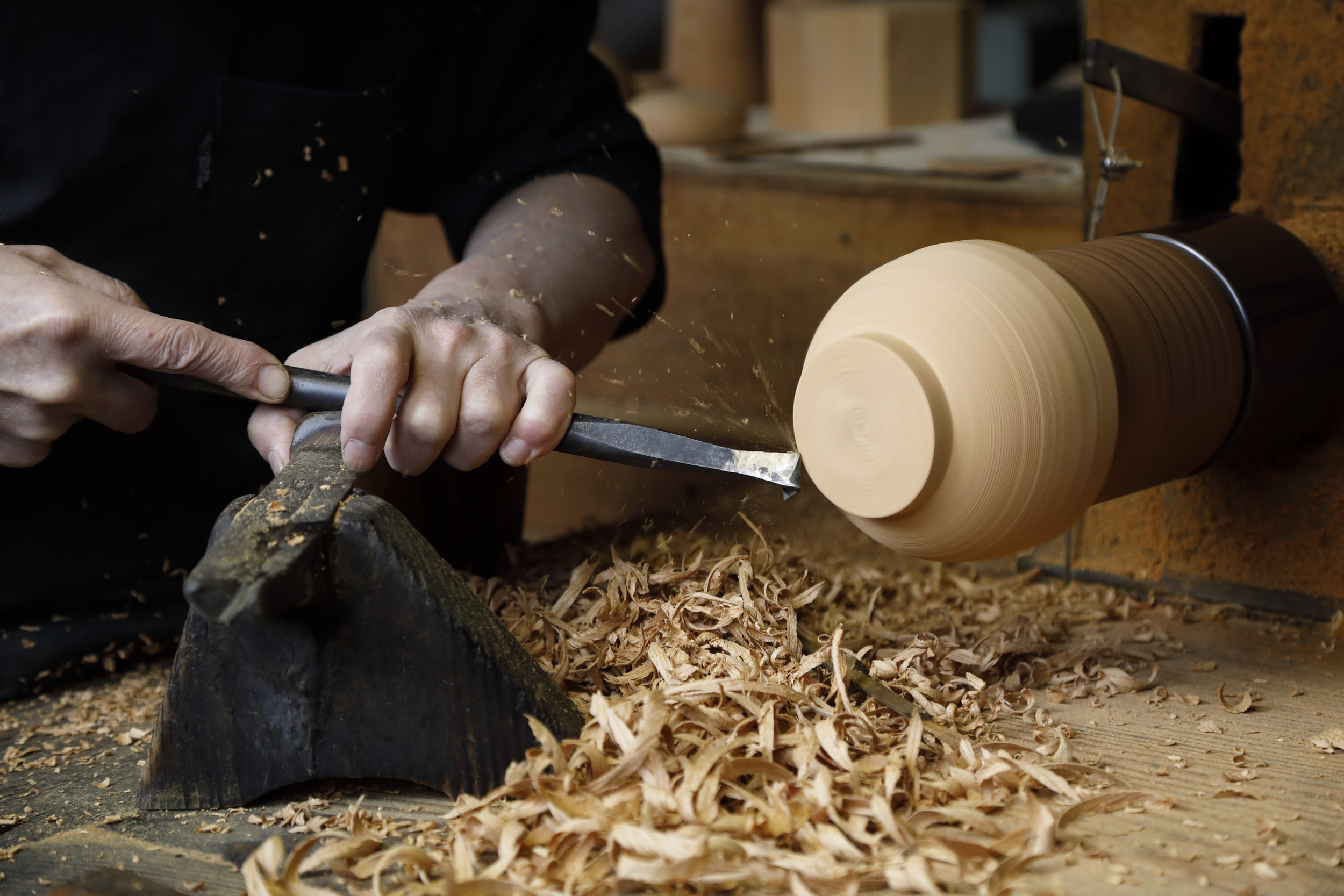 椀木地師は轆轤(ろくろ)を使い欅材を何段階にも分けて挽いていく。段階ごとに乾燥させ歪みを整える。