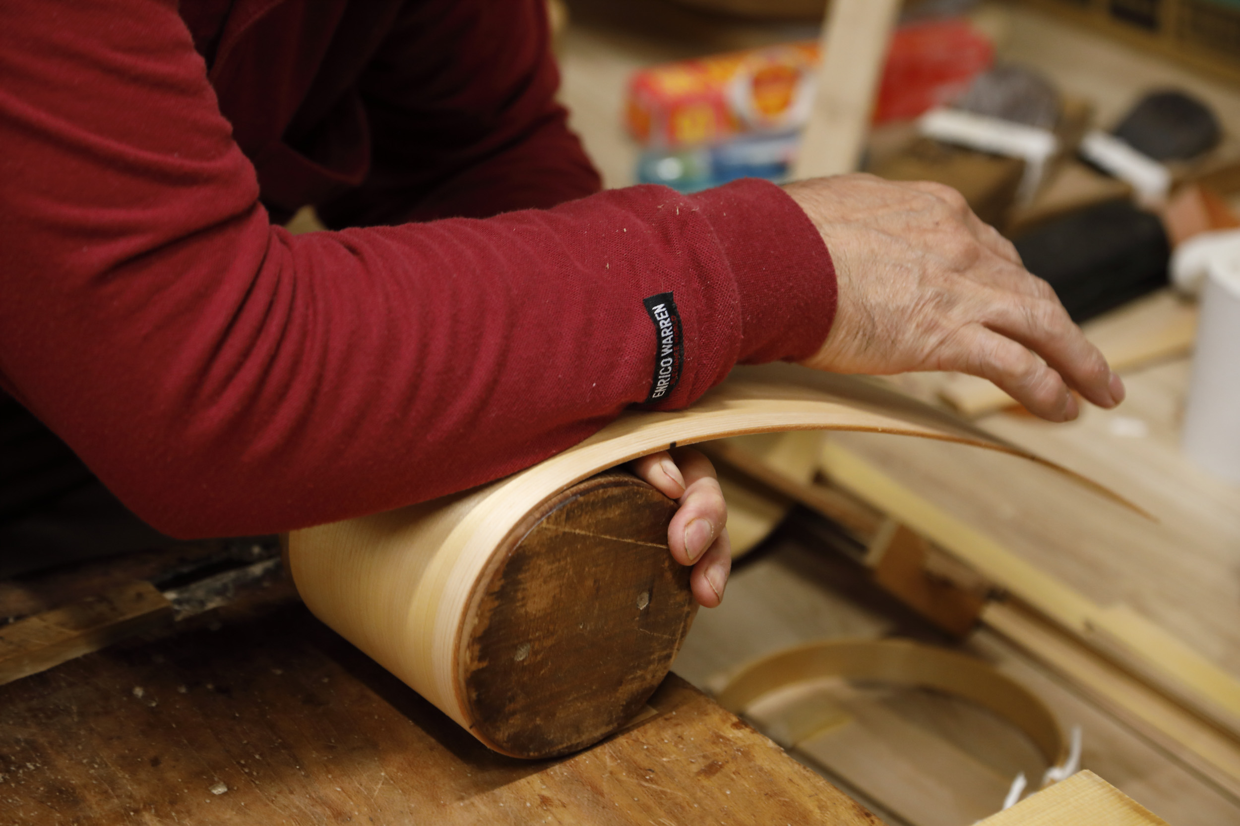 曲げ物師は水につけた能登ヒバを鉋(かんな)で削り、型に沿って曲げる。