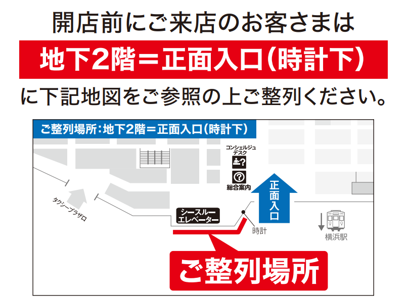 開店前にご来店のお客さまは地下2階=正面入口(時計下)にご整列ください。